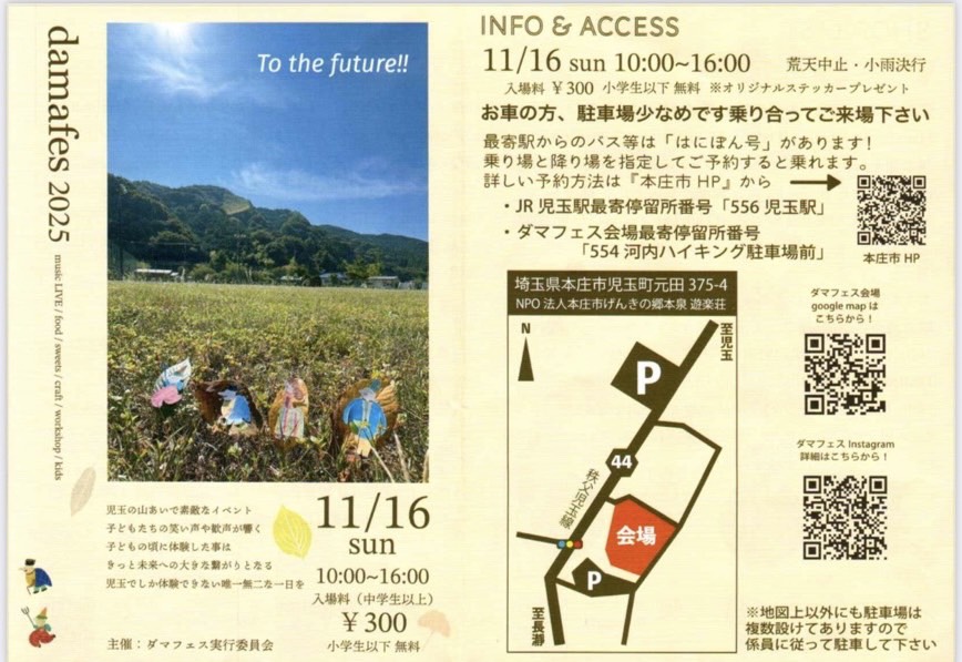 2025.09.10 ダマフェス 期間 2025-11-16~ 時間 10:00~16:00 場所 NPO法人本庄市げんきの郷本泉(埼玉県本庄市児玉町元田375-4) 出店者 チャリティー(干物あり) 一覧ページへ
