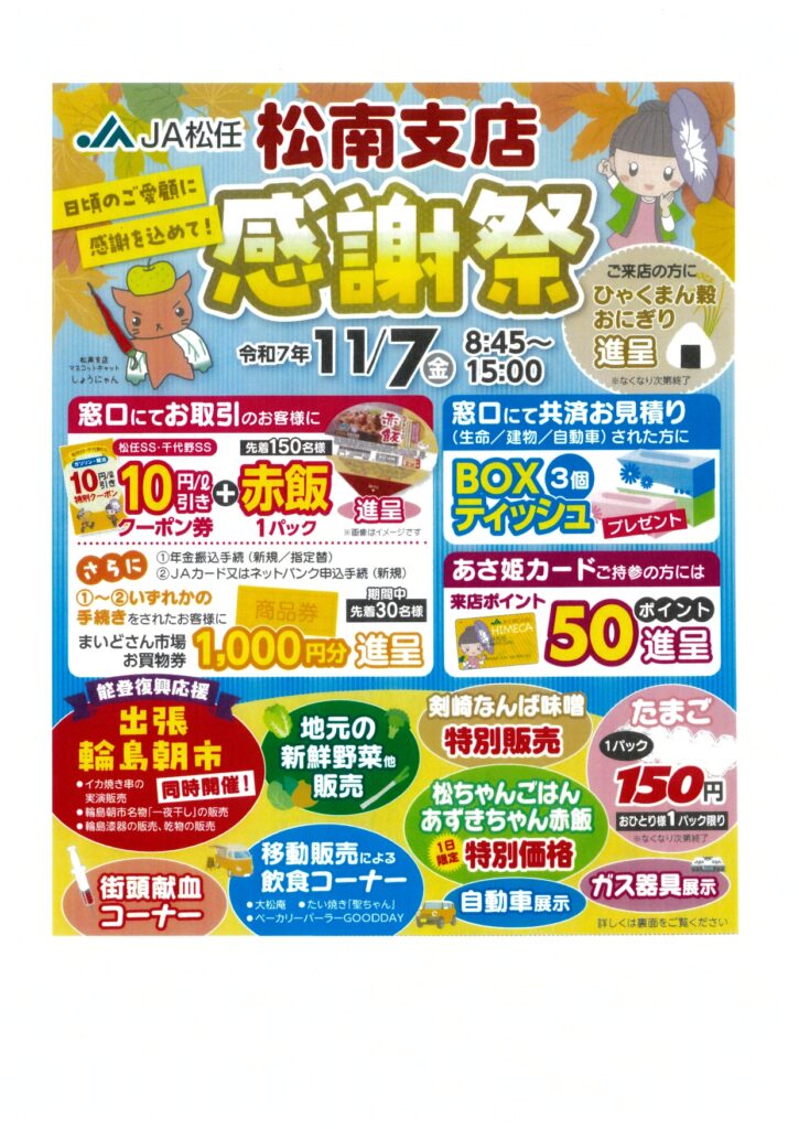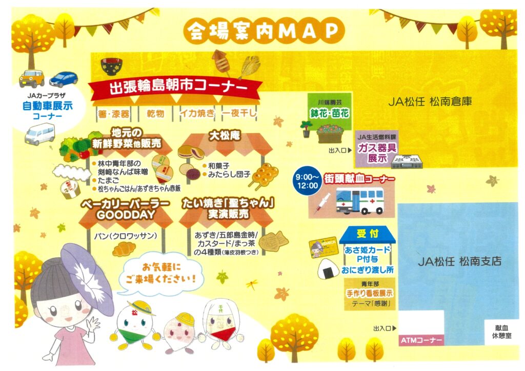| 出店者 | 朝市わじまのさかなや(干物/イカ焼き) ちいさな海産物 いまかど(乾物/クラフト) 小西堂(輪島塗/民芸品/手土産etc...) |